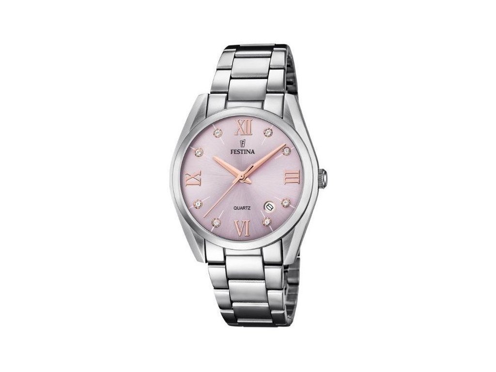 Dámské hodinky Festina z řady Boyfriend. Pouzdro i tah jsou vyrobeny z ušlechtilé oceli. Hodinky mají minerální sklíčko. Rozměr ciferníku je 29 mm a pouzdro má 36,8 mm. Pásek má šířku 18,8 mm. Zapínání je na překlápěcí sponu.Doplňkové parametry