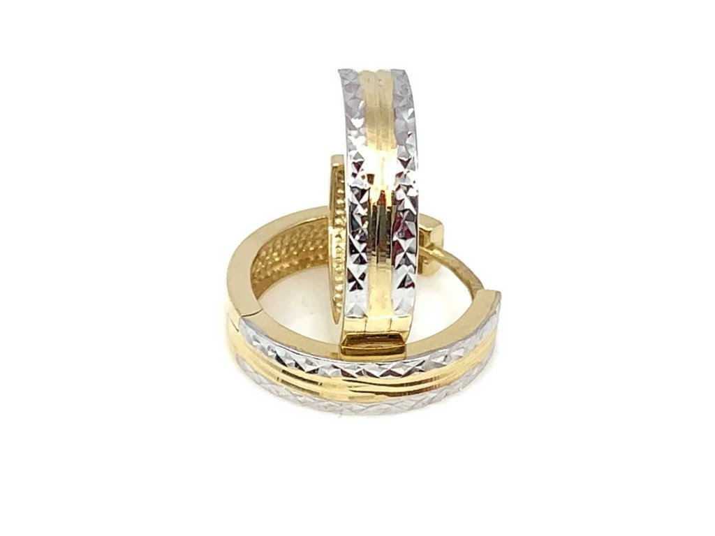Krásné dámské náušnice ze žlutého i bílého zlata (585/1000) potěší každou ženu. Náušnice mají tvar kruhu, krajní proužky jsou z bílého zlata a prostřední proužek je ze žlutého zlata. Všechno naše zboží je značeno puncovními značkami uznanými Puncovním úřadem ČR.Doplňkové parametry