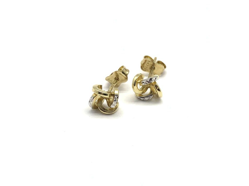 Hezké náušnice v kombinaci žlutého a bílého zlata (585/1000). Mají tvar propletaných kroužků. Zapínání je na uzetu. Všechno naše zboží je označeno puncovními značkami uznanými Puncovním úřadem ČR.Doplňkové parametry