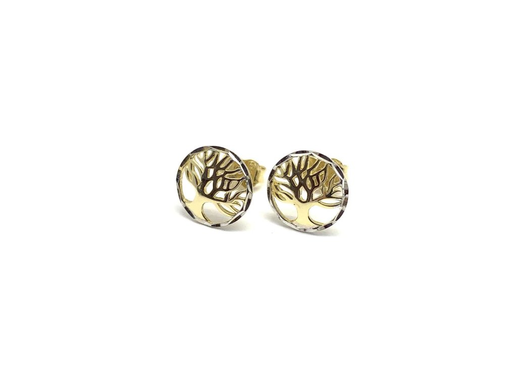 Krásné dámské náušnice v kombinaci bílého a žlutého zlata (585/1000). Mají tvar kolečka, které je vyplněné stromem života. Po obvodu jsou zdobené broušením. Zapínání je na puzetu. Všechno naše zboží je označeno puncovními značkami uznanými Puncovním úřadem ČR.Doplňkové parametry