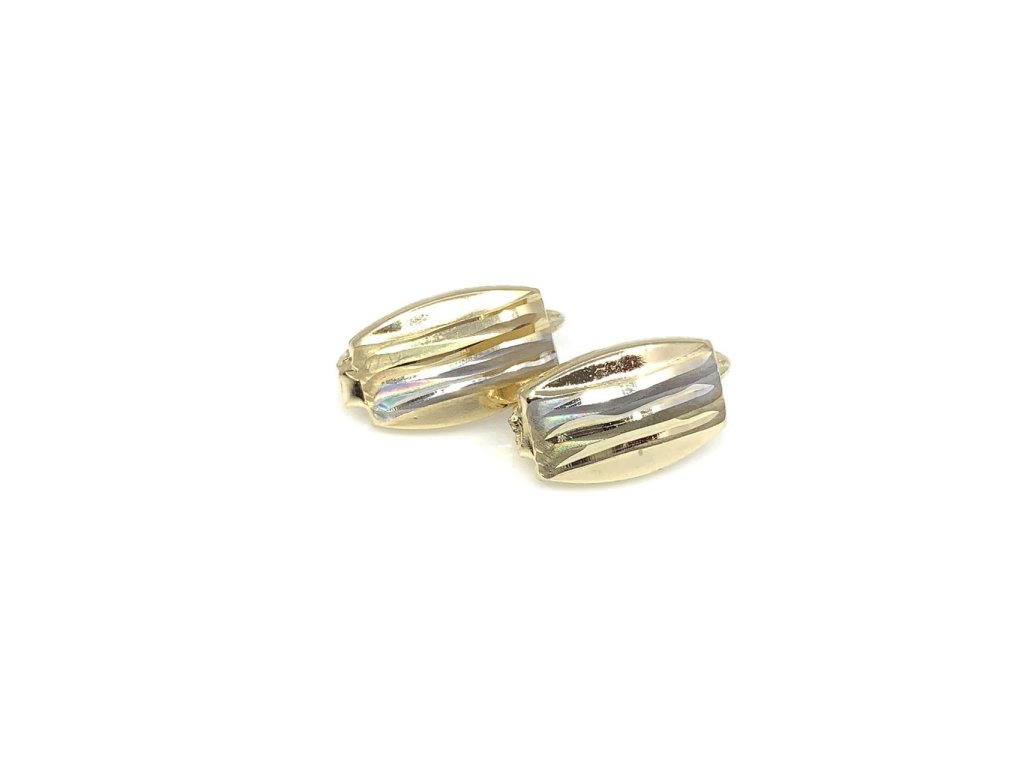 Nádhernédámské náušnice v kombinaci žlutého a bílého zlata (585/1000). Mají tvar obdélníku, který je ozdoben broušením. Zapínání je na klapku. Všechno naše zboží je označeno puncovními značkami, které jsou uznané Puncovním úřadem ČR.Doplňkové parametry