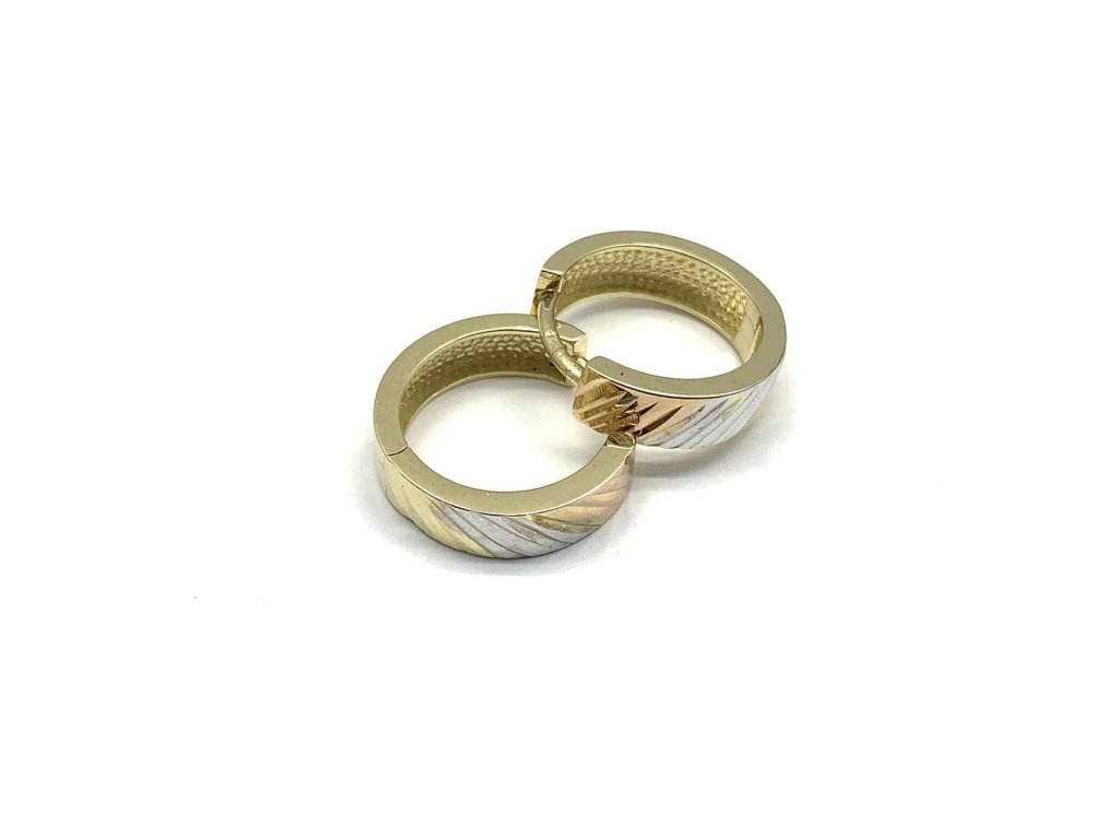 Krásné dámské náušnice v kombinaci žlutého, rose a bílého zlata (585/1000). Mají tvar kruhů, kde se střídají proužky žlutého, rose a bílého zlata. V přední část jsou zdobené broušením. Všechno naše zboží je označeno puncovními značkami uznanými Puncovním úřadem ČR.Doplňkové parametry