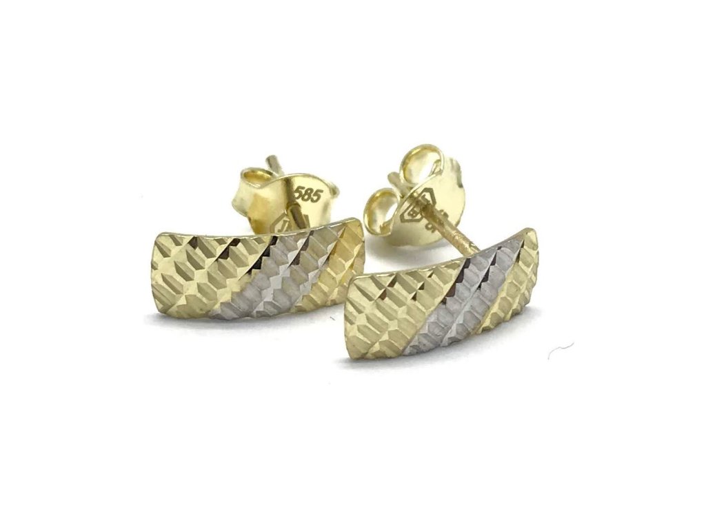 Krásné dámské náušnice v kombinaci žlutého a bílého zlata (585/1000). Mají tvar obdélníku, který je jemně broušený. Zapínání je na puzetu. Všechno naše zboží je označeno puncovními značkami uznanými Puncovním úřadem ČR.Doplňkové parametry