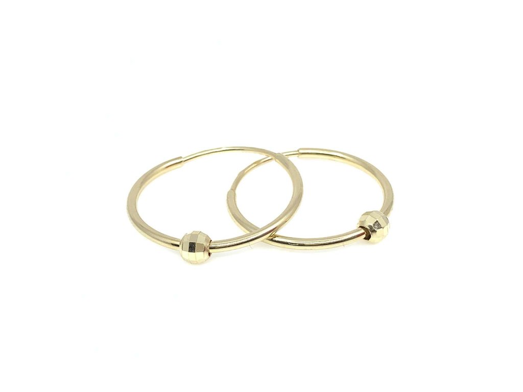 Krásné dámské náušnice ze žlutého zlata (585/1000). Náušnice jsou ve tvaru kruhů, které jsou hladké. Jako ozdobu mají kuličku, která je zdobená broušením.Všechno naše zboží je označeno puncovními značkami uznanými Puncovním úřadem ČR.Doplňkové parametry
