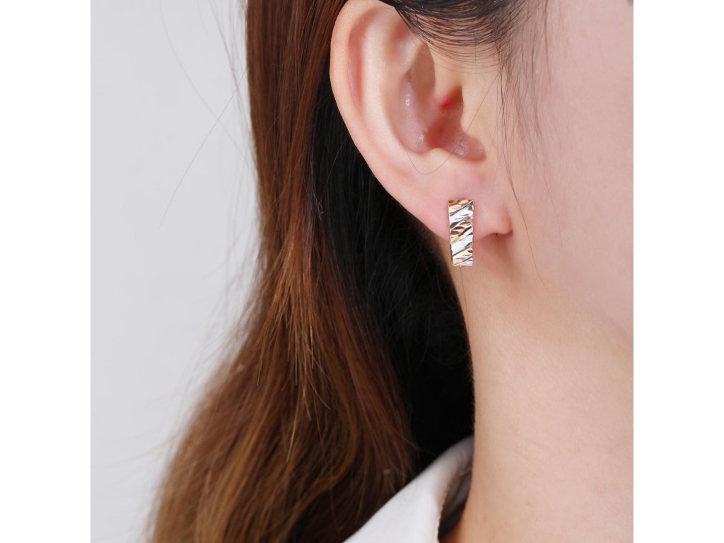 Nápadné, krásně broušené náušnice ze žlutého zlata (585/1000) zdobené proužky z bílého a růžového zlata. Zapínání je na klapku. Všechno naše zboží je označeno puncovními značkami uznanými Puncovním úřadem ČR.Doplňkové parametry