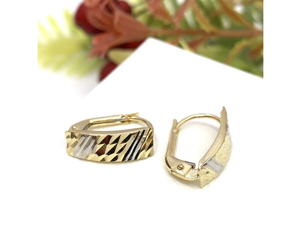 Krásné náušnice ze žlutého zlata (585/1000), které mají obdélníkový tvar zdobený broušením a bílým zlatem se zapínáním na klapku. Všechno naše zboží je označeno puncovními značkami uznanými Puncovním úřadem ČR.Doplňkové parametry