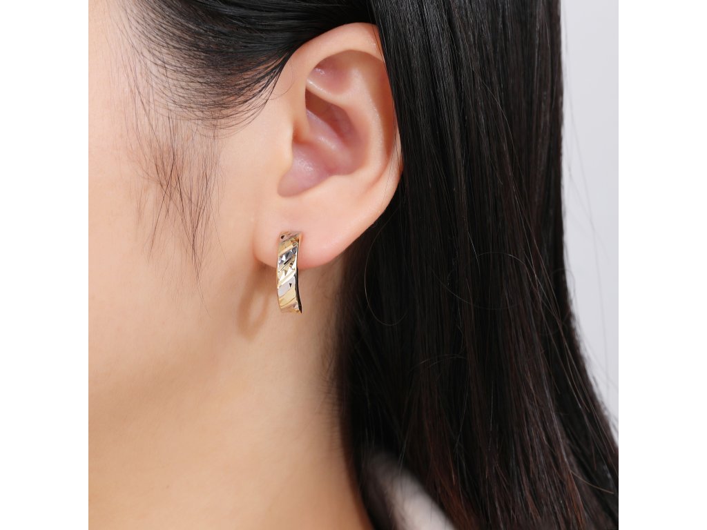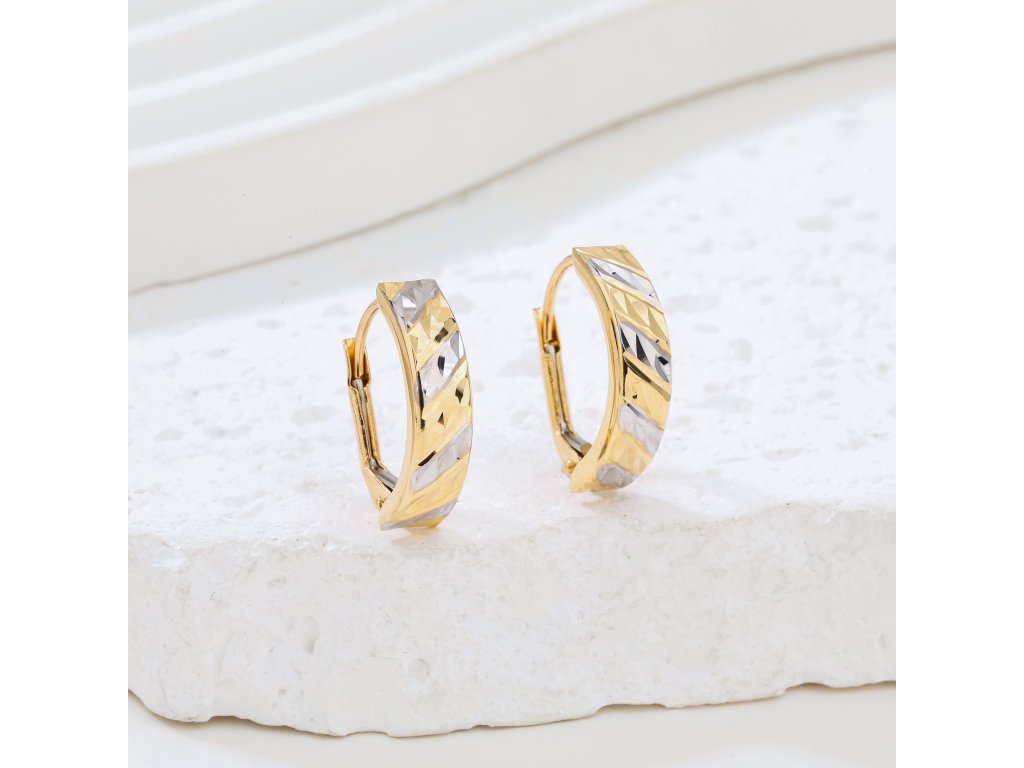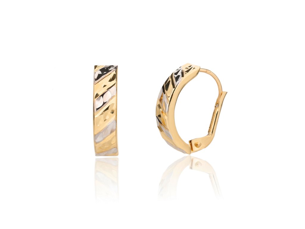 Luxusní náušnice ze žlutého zlata (585/1000) s kterými upoutáte. Bohatě rytý obloukovitý obdélník je zdoben bílým zlatem. Zapínání je na klapku. Všechno naše zboží je označeno puncovními značkami uznanými Puncovním úřadem ČR.Doplňkové parametry