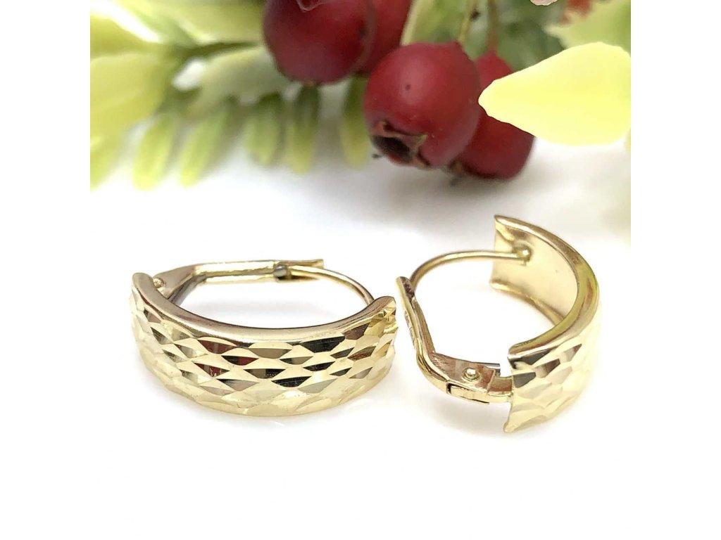 Tyto náušnice ze žlutého zlata (585/1000) Vás upoutají bohatou rytinou, která vytváří při nošení krásné odlesky. Zapínání je na klapku. Všechno naše zboží je označeno puncovními značkami uznanými Puncovním úřadem ČR.Doplňkové parametry