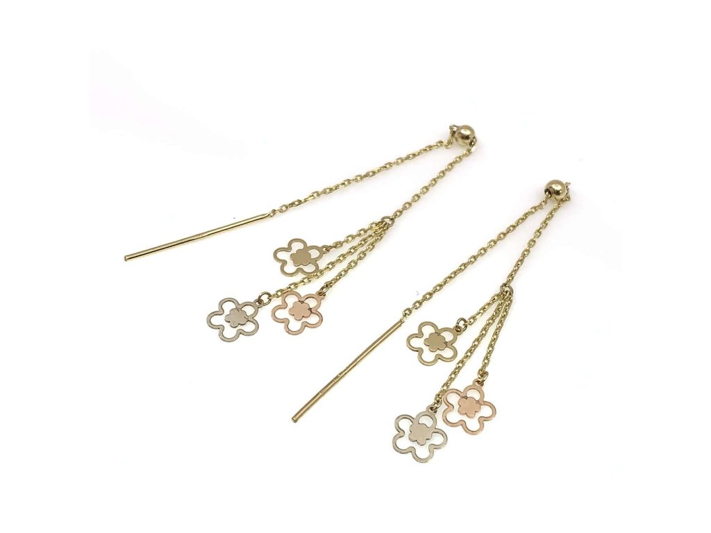 Moderní náušnice ze žlutého zlata (585/1000) kombinavané s řetízkem typu anker a ozdobami ve tvaru tří kytiček a jedné kuličky. Náušnice jsou protahovací. Všechno naše zboží je označeno puncovními značkami uznanými Puncovním úřadem ČR.Doplňkové parametry