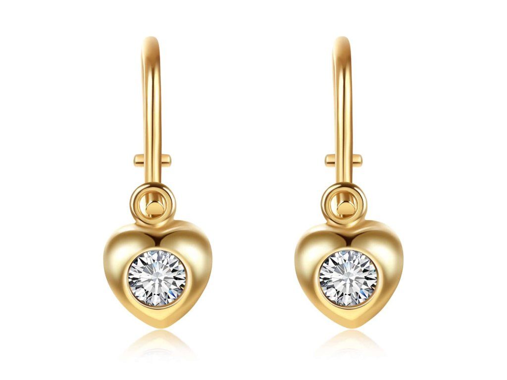 Dětské náušnice ze žlutého zlata (585/1000) budou slušet každé malé slečně. Mají tvar srdce, které vyplňuje bílý zirkon. Náušnice jsou na brizuru. Všechno naše zboží je označeno puncovními značkami uznanými Puncovním úřadem ČR.Doplňkové parametry