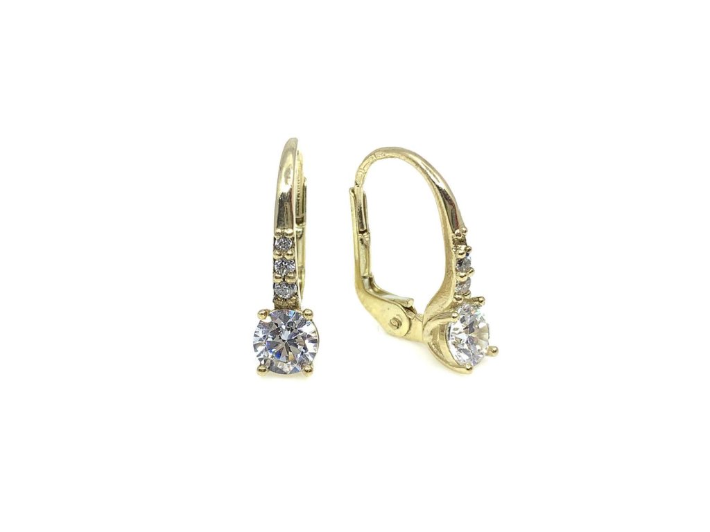 Moderní dámské náušnice ze žlutého zlata (585/1000). Centrální bílý zirkon je doplněn drobnými zirkony, které jsou zasazené nad ním. Náušnice se zapínají na klapku. Všechno naše zboží je označeno puncovními značkami uznanými Puncovním úřadem ČR.Doplňkové parametry