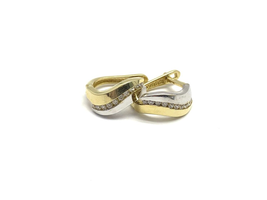 Nádherné dámské náušnice z kombinace žlutého a bílého zlata (585/1000). Náušnice mají půlkruhový tvar. Přední část je zozdělena na dvě poloviny. Jedna z bílého a druhá ze žlutého zlata. Uprostřed jsou zdobené drobnými bílými zirkony. Zapínání je francouzské. Všechno naše zboží je označeno puncovními značkami uznanými Puncovním úřadem ČR.Doplňkové parametry