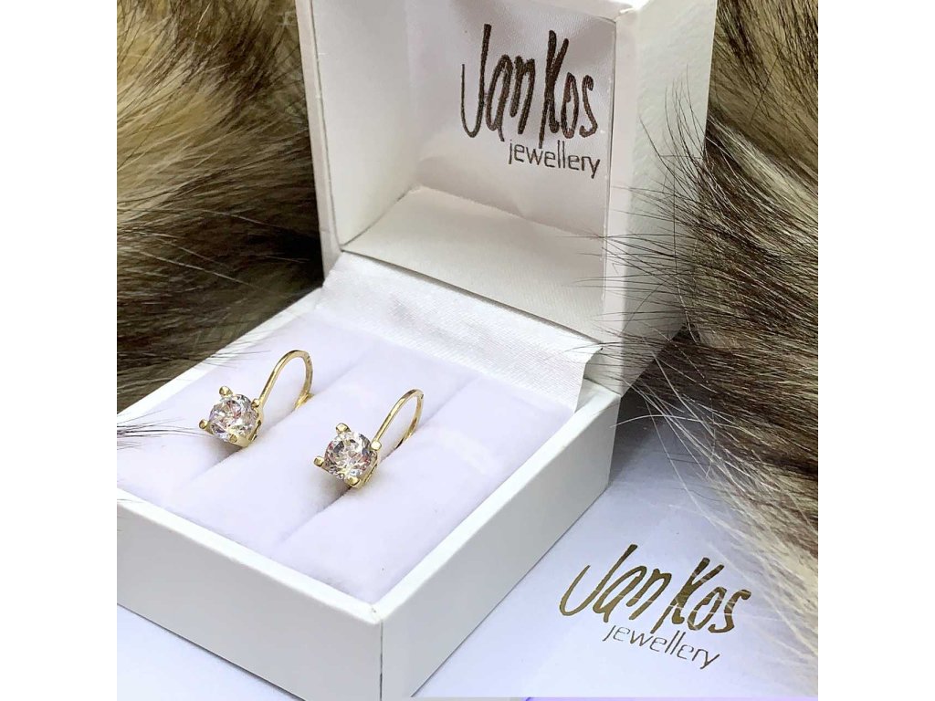 Krásné dámské náušnice ze žlutého zlata (585/1000). Mají jeden bílý centrální zirkon, který je uchycený krapničkami. Zapínání je na klapku. Všechno naše zboží je označeno puncovními značkami uznanými Puncovním úřadem ČR.Doplňkové parametry