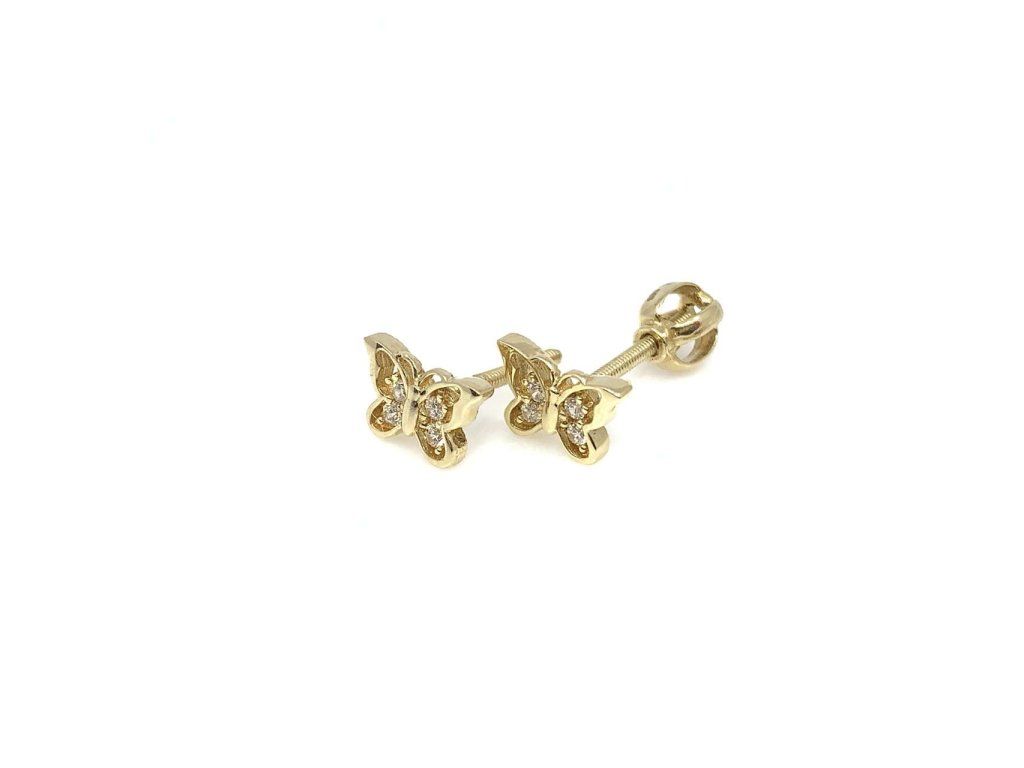 Krásné náušnice ze žlutého zlata (585/1000). Mají tvar motýla, který je vyplněn malými bílými zirkony a po obvodu je hladký obrys. Zapínání je na šroubek. Všechno naše zboží je označeno puncovními značkami uznanými Puncovním úřadem ČR.Doplňkové parametry