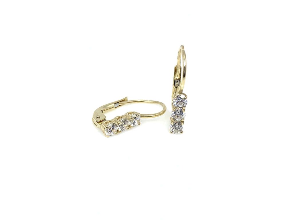 Elegantní dámské náušnice ze žlutého zlata(585/1000). Mají tvar tří čtverců nad sebou, které jsou z malých bílých zirkonů. Náušnice mají zapínání na klapku. Všechno naše zboží je označeno puncovními značkami uznanými Puncovním úřadem ČR.Doplňkové parametry