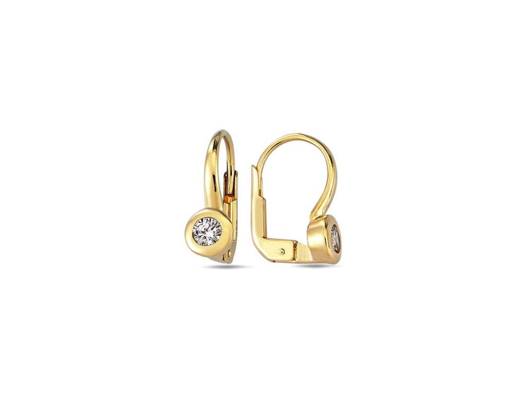 Krásné dámské náušnice ze žlutého zlata (585/1000). Náušnice mají kulatý tvar, který má ve středu jeden větší bílý zirkon. Náušnice mají zapínání na klapku. Všechno naše zboží je označeno puncovními značkami uznanými Puncovním úřadem ČR.Doplňkové parametry