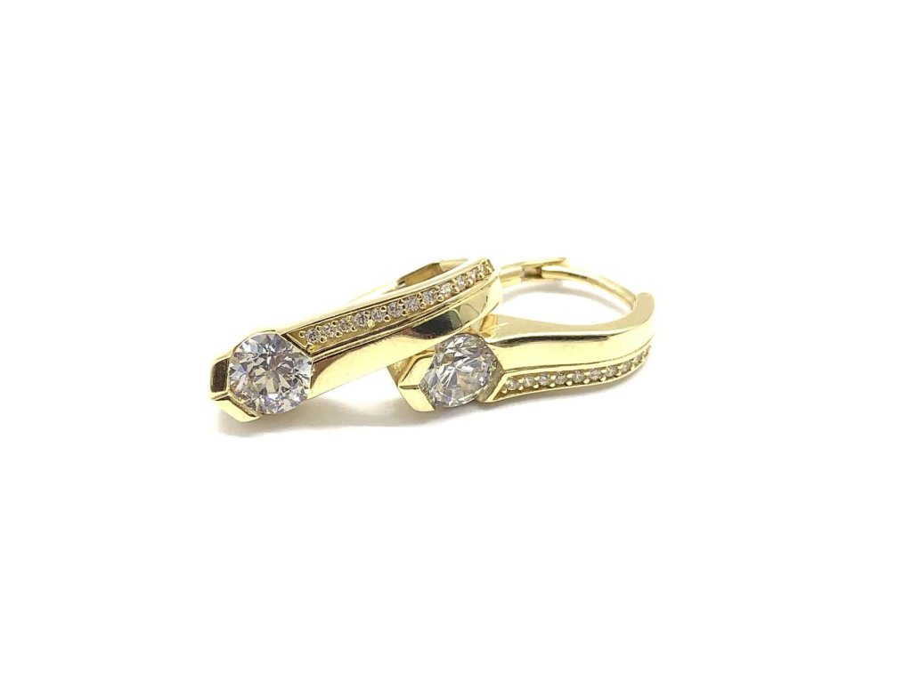 Nádherné dámské náušnice ze žlutého zlata (585/1000). Mají obdélníkový tvar, který je ve spodní části osazen jedním větším zirkone. Horní část je z poloviny hladká a druhá polovina je zdobená malými bílými zirkony. Zapínání je na klapku. Všechno naše zboží je označeno puncovními značkami uznanými Puncovním úřadem ČR.Doplňkové parametry