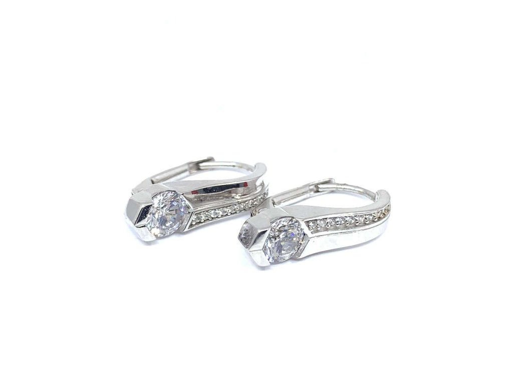 Moderní dámské náušnice z bílého zlata (585/1000). Mají tvar obdélníku. Polovina je hladká a druhá je osázená bílými zirkony. Ve spodní části je jeden větší bílý zirkon. Náušnice se zapínají na klapku. Povrchová úprava rhodiem zajistí šperku vyšší lesk a odolnost. Všechno naše zboží je označeno puncovními značkami uznanými Puncovním úřadem ČR.Doplňkové parametry