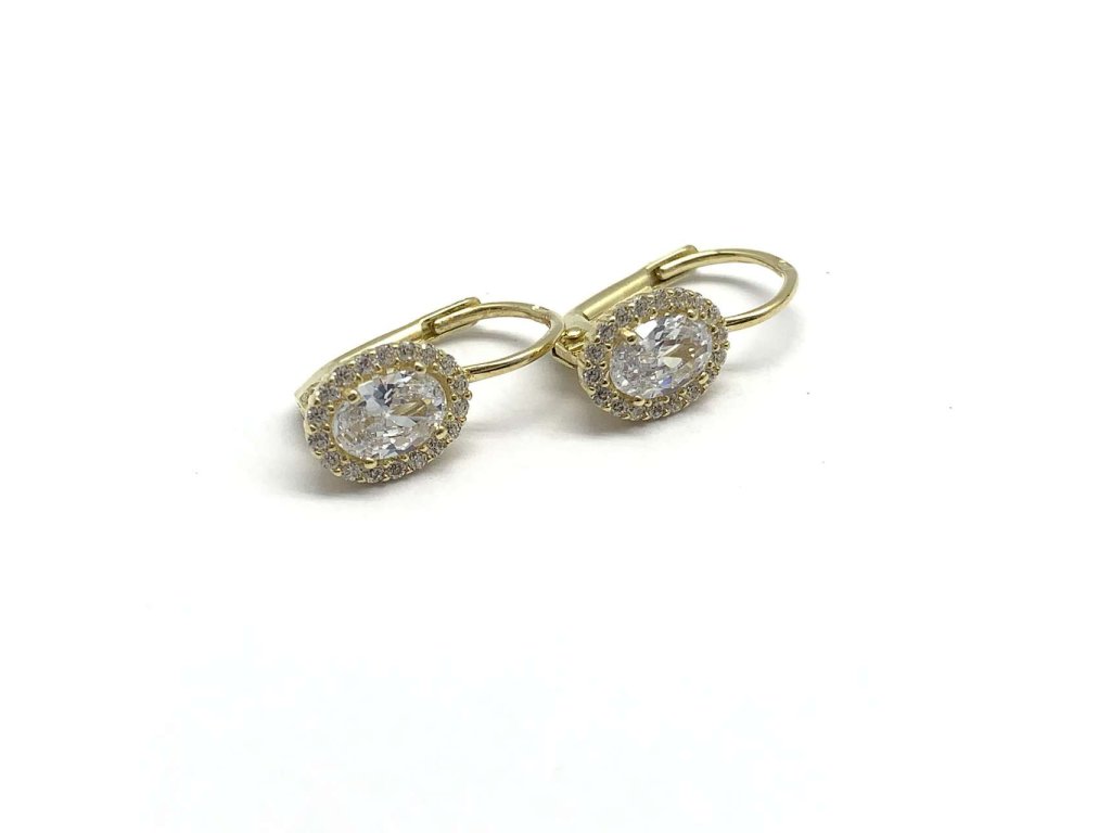 Elegantní dámské náušnice ze žlutého zlata (585/1000). Mají oválný tvar, který je ozdoben několika menšími zirkony a jedním větším centrálním bílým zirkonem. Náušnice se zapínají na klapku. Všechno naše zboží je označeno puncovními značkami uznanými Puncovním úřadem ČR.Doplňkové parametry