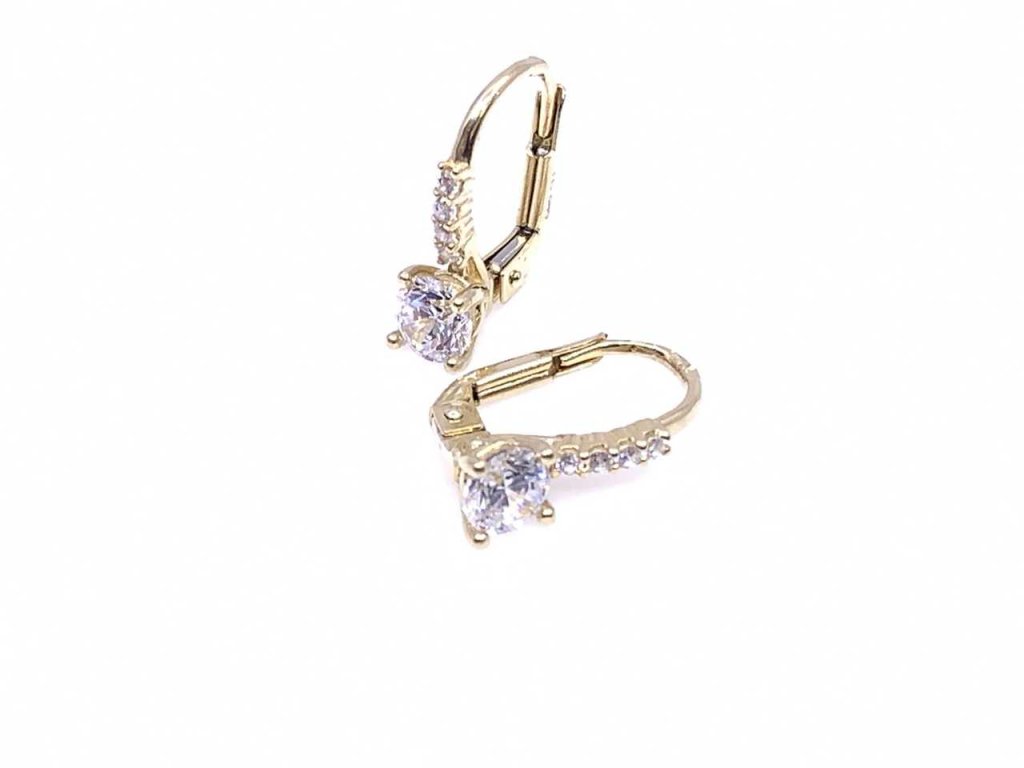 Luxusní dámské náušnice ze žlutého zlata (585/1000). Ozdobu tvoří jeden větší centrální bílý zirkon, uchycený krapničkami , který je zajímavě doplněn zirkony menšími na nožce zapínání. Zapínání je na klapku. Všechno naše zboží je označeno puncovními značkami uznanými Puncovním úřadem ČR.Doplňkové parametry