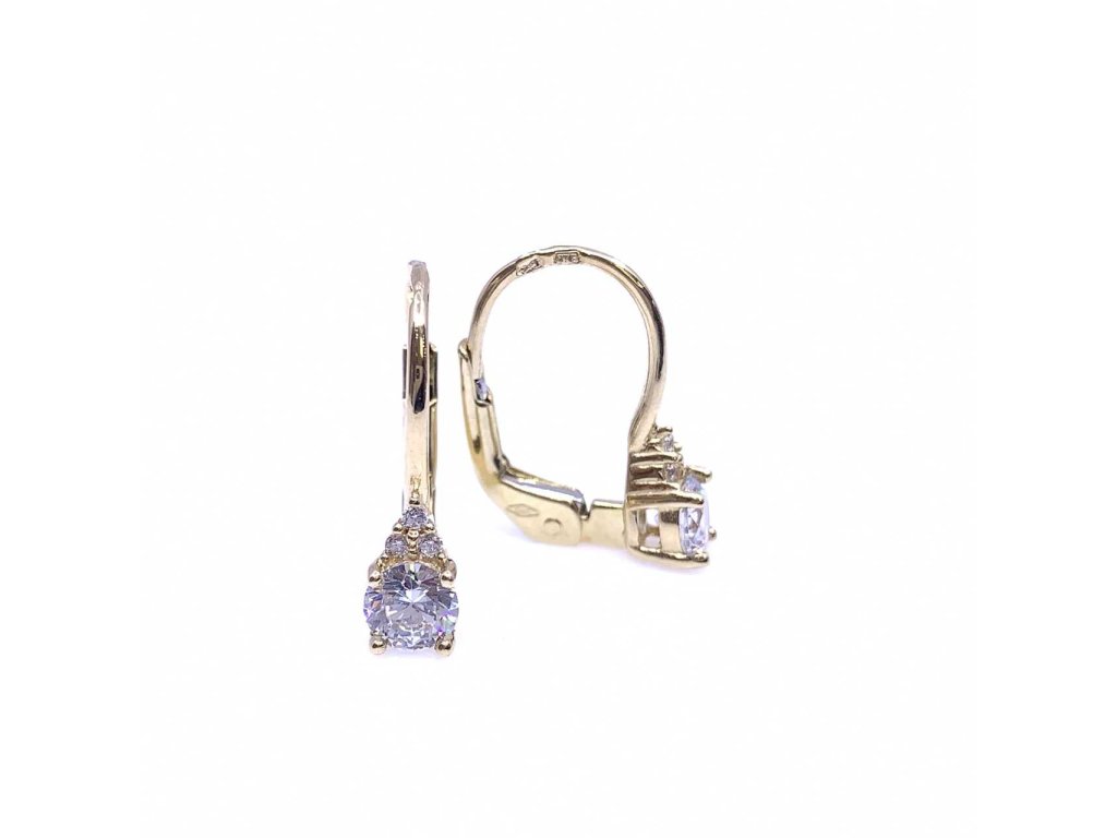 Krásné dámské náušnice ze žlutého zlata (585/1000), které jsou zdobené jedním centrálním bílým zirkonem a nad ním jsou tři malé bílé zirkony. Zapínání je na klapku. Všechno naše zboží je označeno puncovními značkami uznanými Puncovním úřadem ČR.Doplňkové parametry