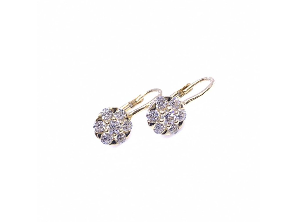 Krásné dámské náušnice ze žlutého zlata (585/1000). Zapínání je na klapku. Mají tvar kytičky, která má vsazené zářivé bílé zirkony. Všechno naše zboží je označeno puncovními značkami uznanými Puncovním úřadem ČR.Doplňkové parametry