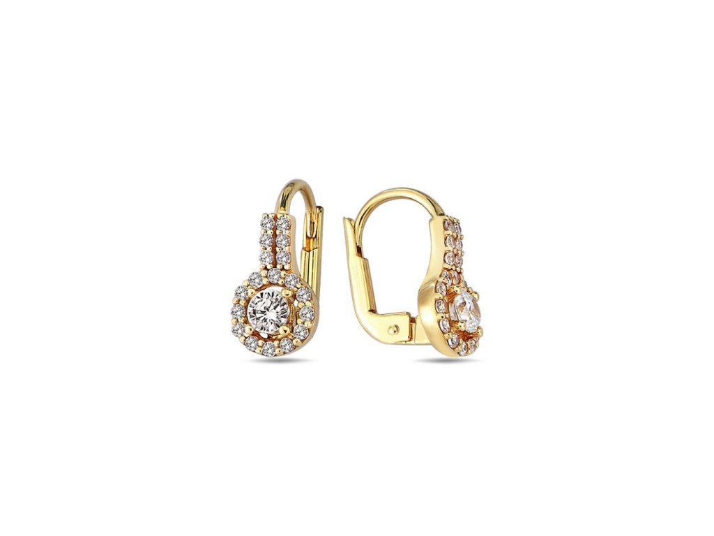 Krásné dámské náušnice ze žlutého zlata (585/1000). Náušnice mají kulatý tvar, který tvoří jeden větší centrální bílý zirkon, po obvoudu a nad ním jsou malé bílé zirkony. Zapínání je na klapku. Všechno naše zboží je označeno puncovními značkami uznanými Puncovním úřadem ČR.Doplňkové parametry