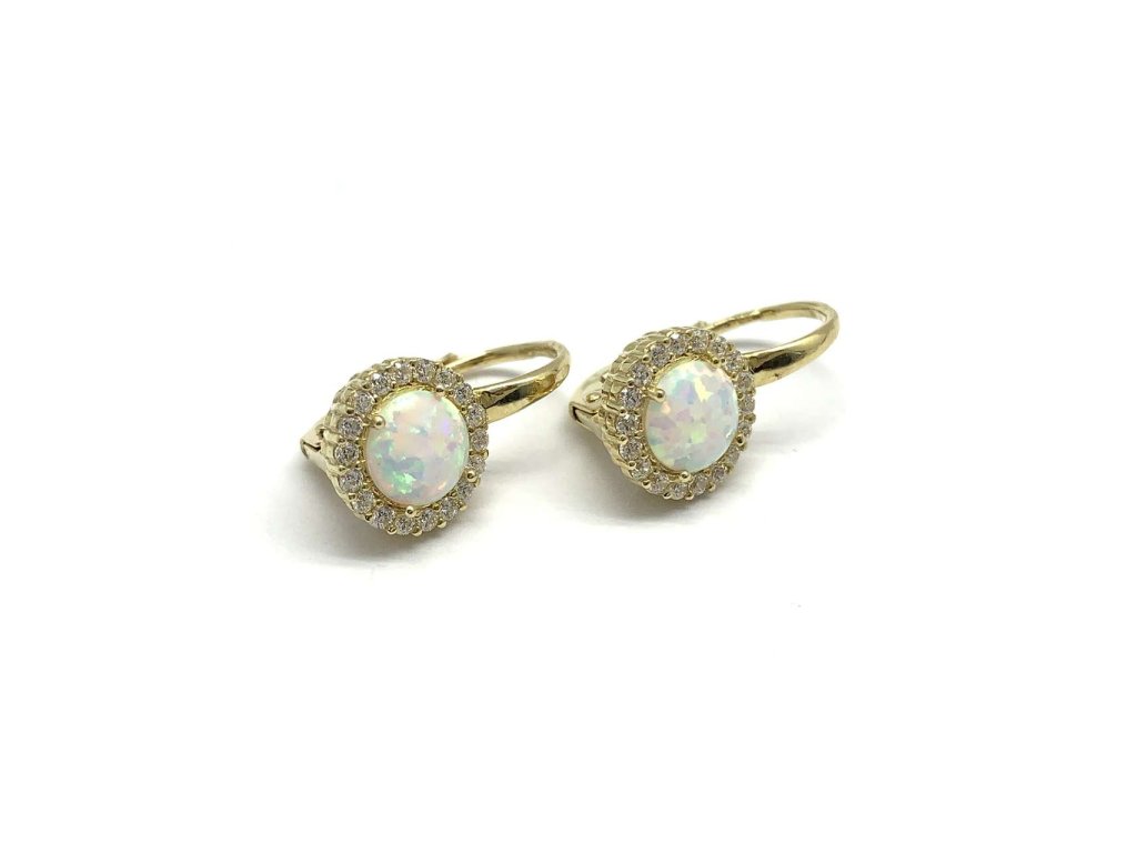 Krásné dámské náušnice ze žlutého zlata (585/1000). Mají kulatý tvar, který je vyplněný jedním bílým syntetickým opálem a po obvodu jsou malé bílé zirkony. Zapínání je na klapku. Všechno naše zboží je označeno puncovními značkami uznanými Puncovním úřadem ČR.Doplňkové parametry