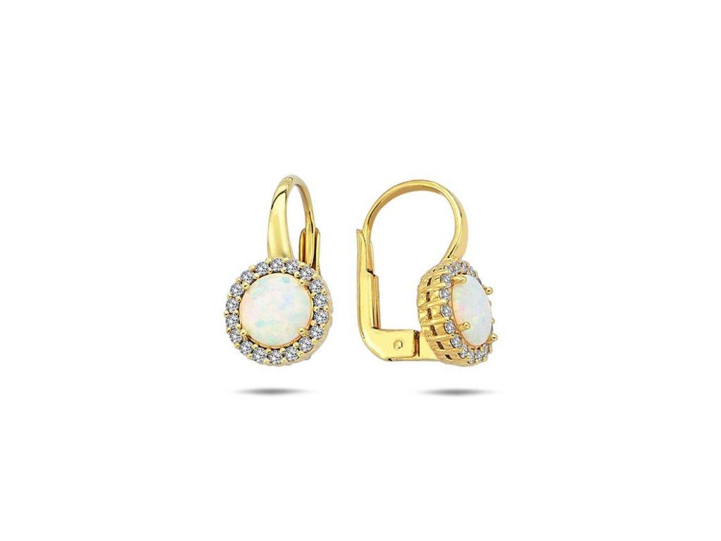 Krásné dámské náušnice ze žlutého zlata (585/1000). Mají kulatý tvar, který je vyplněný jedním bílým syntetickým opálem a po obvodu jsou malé bílé zirkony. Zapínání je na klapku. Všechno naše zboží je označeno puncovními značkami uznanými Puncovním úřadem ČR.Doplňkové parametry