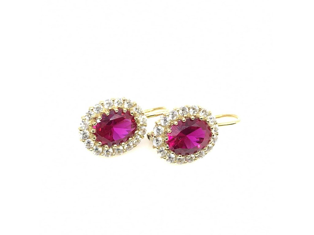 Luxusní dámské náušnice ze žlutého zlata (585/1000). Mají oválný tvar, který má uprostřed jeden centrální červený zirkon. Po obvodu jsou malé bílé zirkony. Zapínání je na klapku. Všechno naše zboží je označeno puncovními značkami uznanými Puncovním úřadem ČR.Doplňkové parametry