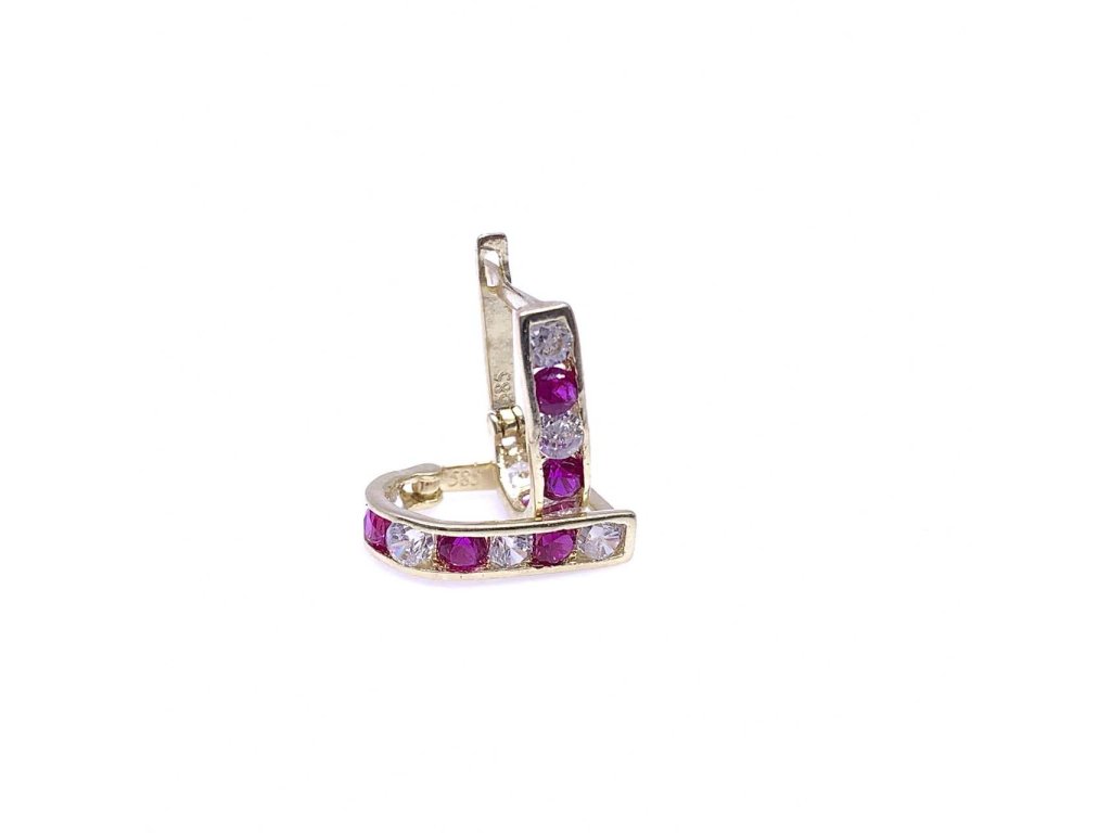 Hezké náušnice ze žlutého zlata (585/1000) potěší ženu i malou slečnu. Ozdoba je ve tvaru úzkého proužku, který je osázen bílými a červenými zirkony. Zapínání je francouzské. Všechno naše zboží je označeno puncovními značkami uznanými Puncovním úřadem ČR.Doplňkové parametry