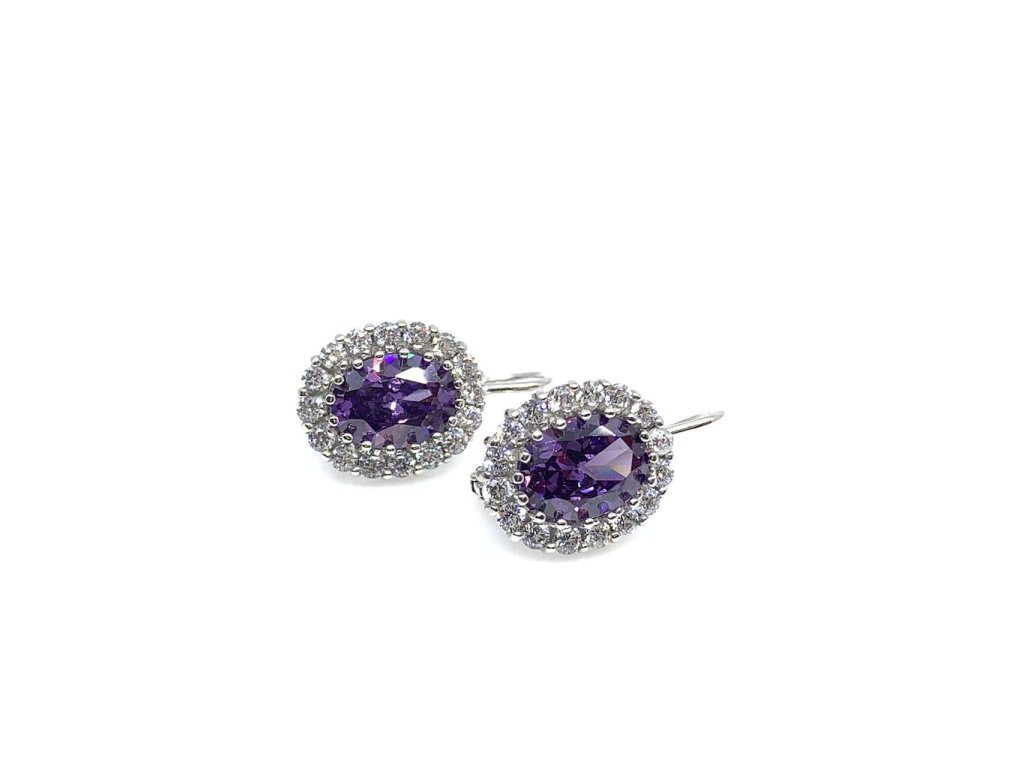 Luxusní dámské náušnice z bílého zlata (585/1000). Mají oválný tvar, který má uprostřed jeden centrální fialový zirkon. Po obvodu jsou malé bílé zirkony. Zapínání je na klapku. Povrchová úprava rhodiem zajistí šperku vyšší lesk a odolnost. Všechno naše zboží je označeno puncovními značkami uznanými Puncovním úřadem ČR.Doplňkové parametry