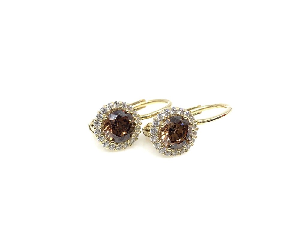 Elegantní dámské náušnice ze žlutého zlata (585/1000). Mají kulatý tvar, který je ozdoben centrálním hnědým zirkonem, která je doplněná drobnými zirkony. Zapínají se na klapku. Všechno naše zboží je označeno puncovními značkami uznanými Puncovním úřadem ČR.Doplňkové parametry