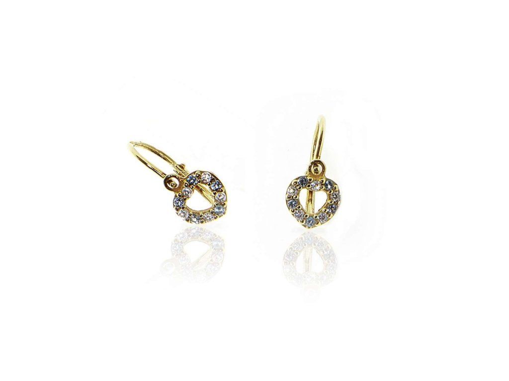 Dětské náušnice ze žlutého zlata (585/1000) budou slušet každé malé slečně. Mají tvar srdce, které je po obvodu střídavě osázené malými bílými a modrými zirkony. Střed srdce je prázdné. Náušnice jsou na brizuru. Všechno naše zboží je označeno puncovními značkami uznanými Puncovním úřadem ČR.Doplňkové parametry