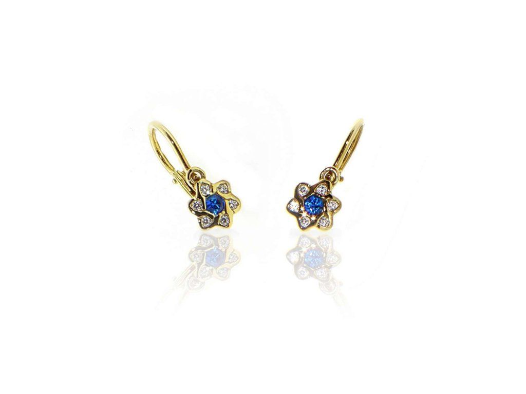 Dětské náušnice ze žlutého zlata (585/1000) budou slušet každé malé slečně. Mají tvar kytky, která je z jednoho centrálního modrého zirkonu a okvětní lístky jsou vyplněny malými bílými zirkony. Náušnice se zapínají na brizuru. Všechno naše zboží je označeno puncovními značkami uznanými Puncovním úřadem ČR.Doplňkové parametry