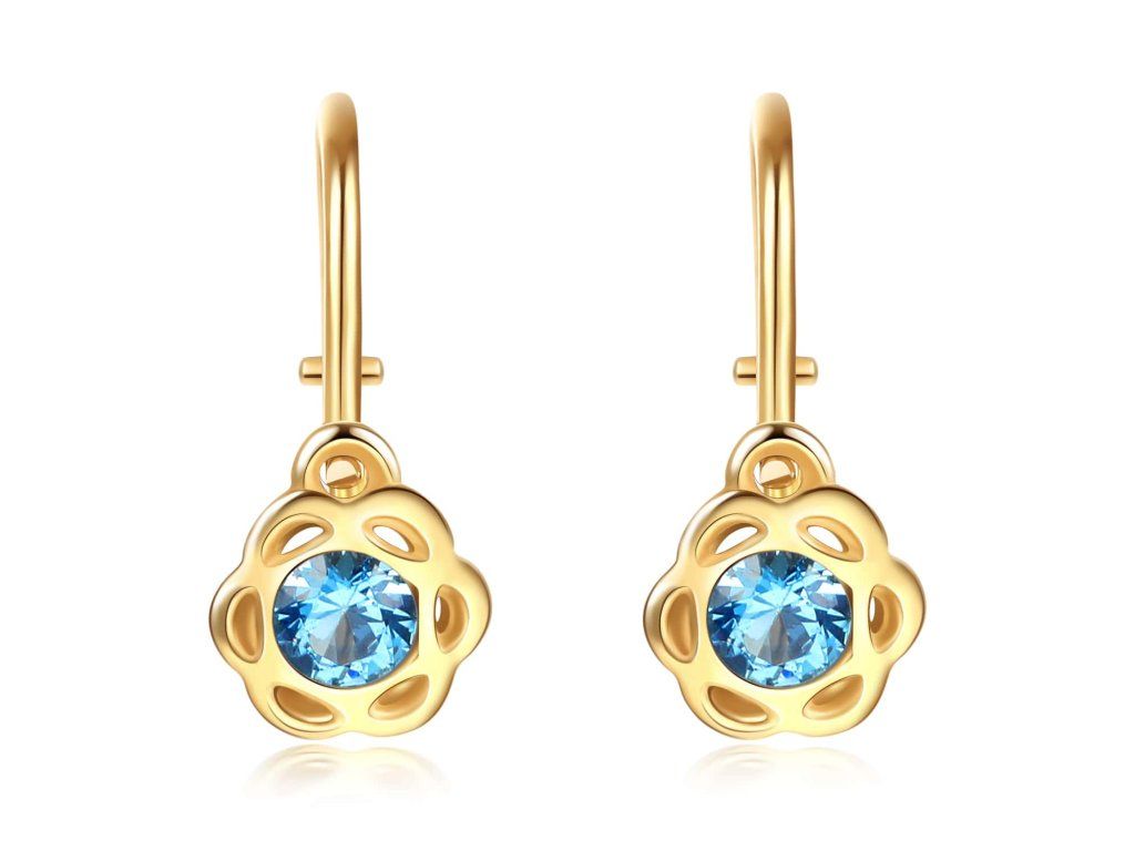 Dětské náušnice ze žlutého zlata (585/1000) jsou dokonalou ozdobou pro malé holčičky. Mají tvar kytky, uprostřed je jeden malý modrý zirkon a okvětní lístky mají hladký obrys. Náušnice mají zapínání na brizuru. Veškeré zboží je označeno puncem ze Státního puncovního úřadu ČR.Doplňkové parametry