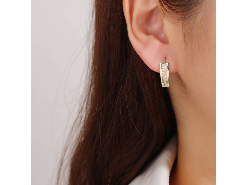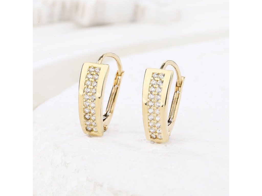 Tyto luxusní náušnice ze žlutého zlata (585/1000) jsou přesně pro Vás. Krásné třpytivé zirkony jsou lemovány lesklým zlatem a proto dávají kamenům vyniknout. Zapínaní na klapku. Všechno naše zboží je označeno puncovními značkami uznanými Puncovním úřadem ČR.Doplňkové parametry