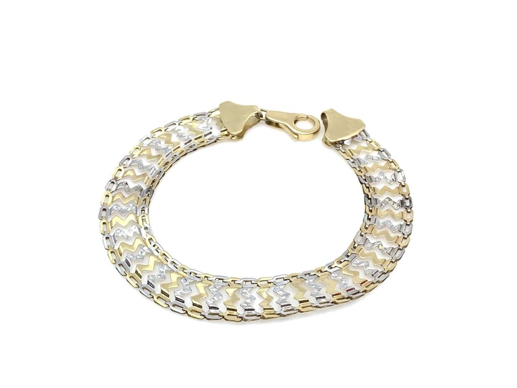 Krásný náramek ze žlutého zlata (585/1000) kombinovaný ze žlutého a bílého zlata bude na Vaší ruce vypadat úchvatně. Vhodný zejména ke zvláštním příležitostem. Šíře náramku je 1 cm. Všechno naše zboží je označeno puncovními značkami uznanými Puncovním úřadem ČR.Doplňkové parametry