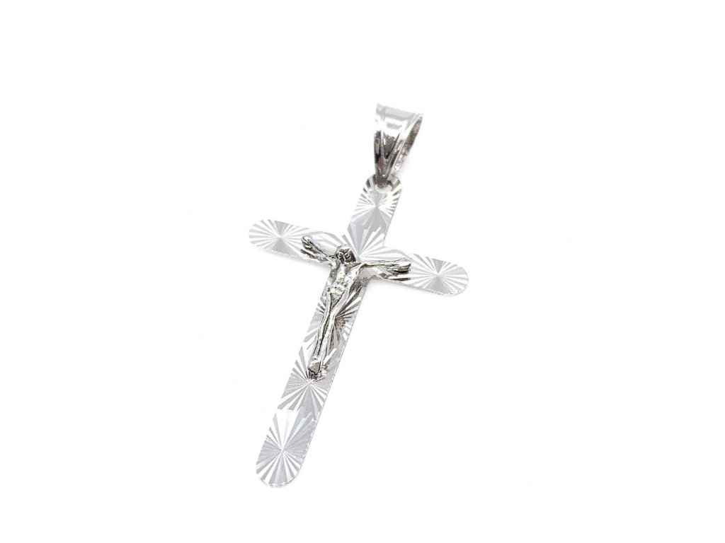 Krásný unisexový přívěsek z bílého zlata (585/1000) ve tvaru kříže s Ježíšem je zdobený broušením a v provedení velkého lesku. Povrchová úprava rhodium šperku zajistí vyšší odolnost a lesk. Všechno naše zboží je označeno puncovními značkami uznanými Puncovním úřadem ČR.Doplňkové parametry