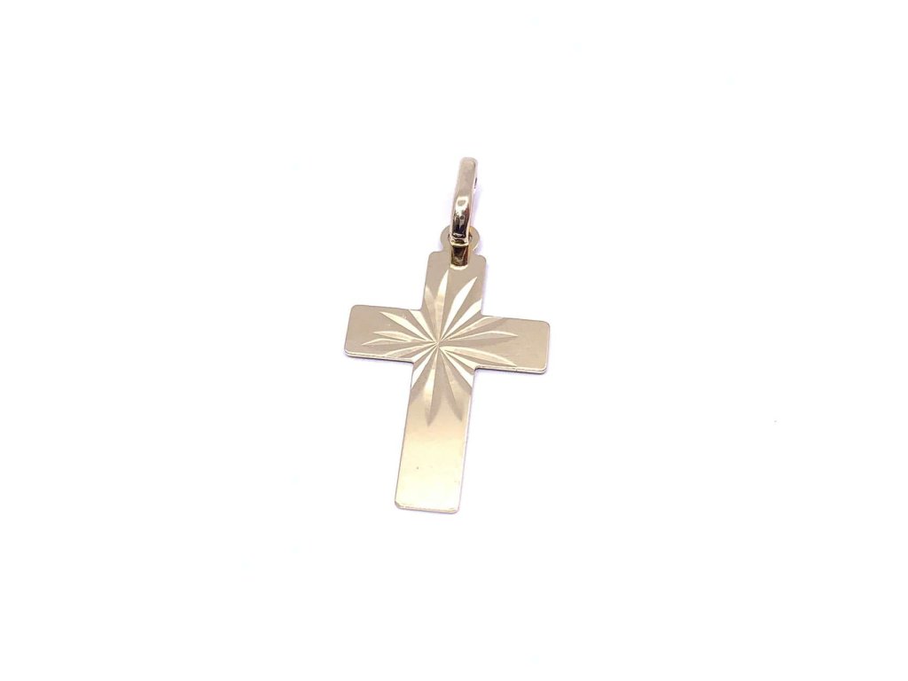Mohutnější přívěsek ze žlutého zlata (585/1000) ve tvaru kříže s výraznou rytinou uprostřed potěší muže i ženu. Všechno naše zboží je označeno puncovními značkami uznanými Puncovním úřadem ČR.Doplňkové parametry