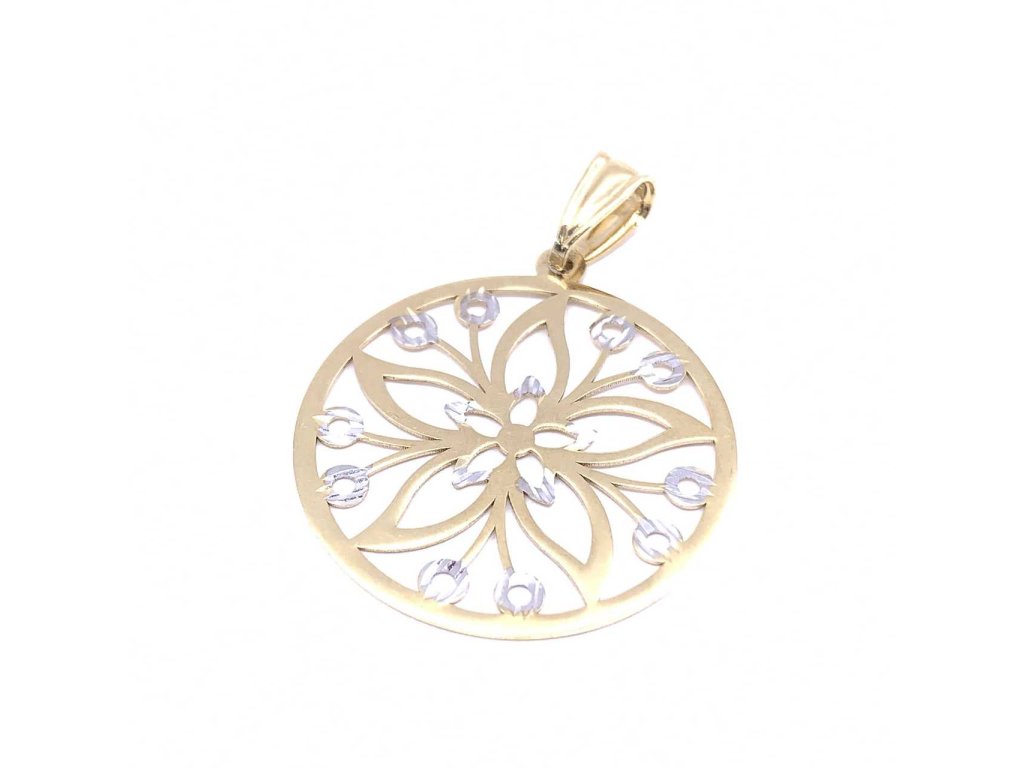 Úžasný přívěs ze žlutého zlata (585/1000) , který Vás potěší krásnou ozdobou. Přívěs má kulatý tvar s přořezáváním ve tvaru kytky, doplněné ozdobami z bílého zlata. Všechno naše zboží je označeno puncovními značkami uznanými Puncovním úřadem ČR.Doplňkové parametry