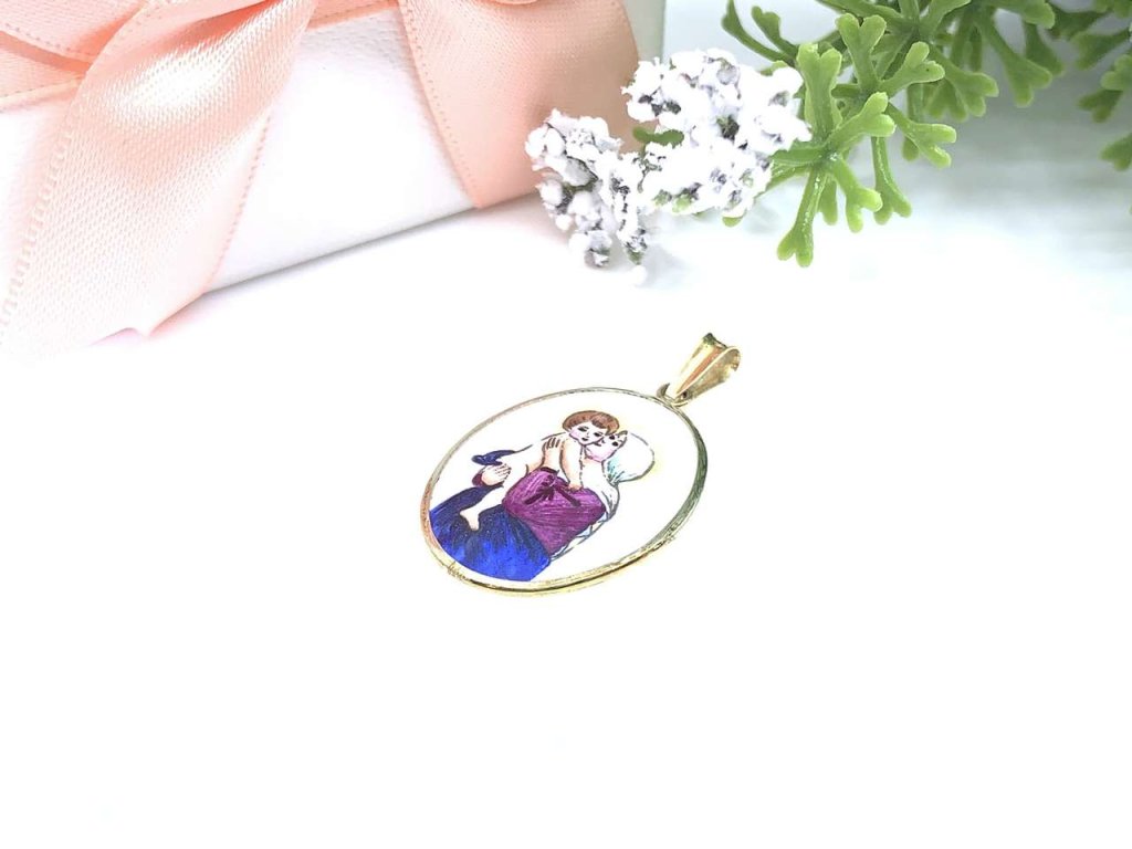 Nádherný přívěsek ze žlutého zlata (585/1000) s motivem Madony s dítětem v náručí. Krásná ruční malba na keramickém povrchu s hladkým rámečkem v oválném tvaru. Všechno naše zboží je označeno puncovními značkami uznanými Puncovním úřadem ČR.Doplňkové parametry