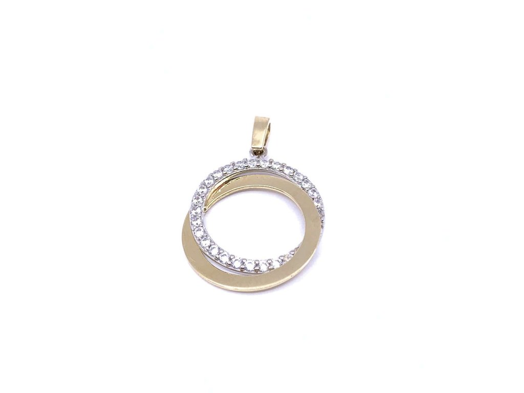 Krásný přívěsek ze žlutého zlata (585/1000) potěší každou ženu. Přívěsek je ve tvaru dvou kruhů z nichž jeden je hladký a lesklý a druhý je osázen bílými zirkony. Všechno naše zboží je označeno puncovními značkami uznanými Puncovním úřadem ČR.Doplňkové parametry
