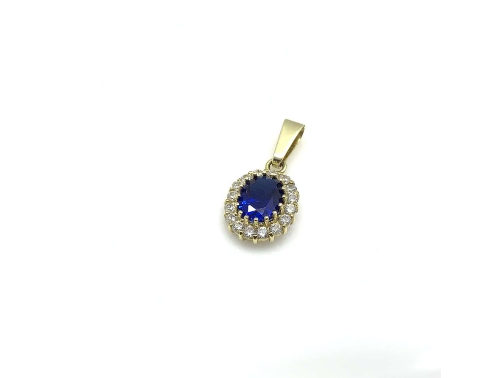 Krásný dámský přívěsek ze žlutého zlata (585/1000) má tvar oválu, který je vyplněný jedním centrálním modrým zirkonem a obvod je osázen drobnými bílými zirkony. Všechno naše zboží je označeno puncovními značkami uznanými Puncovním úřadem ČR.Doplňkové parametry