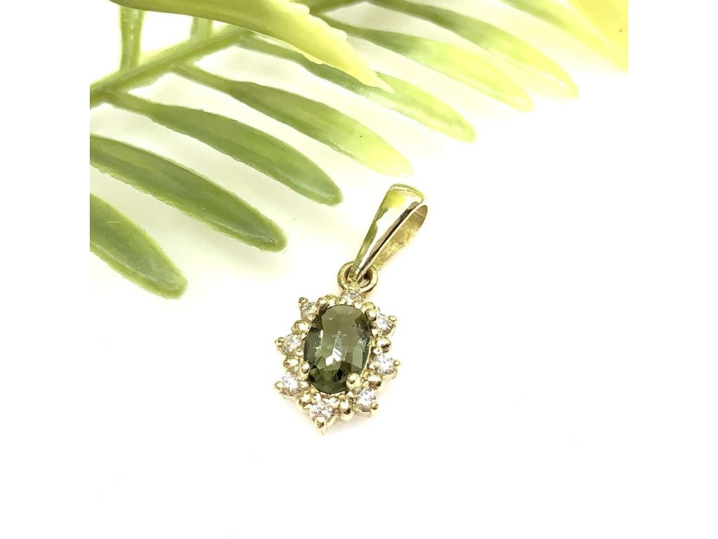 Nádherný přívěsek ze žlutého zlata (585/1000) v oválném provedení se vsazeným přírodním vltavínem a brilianty. Krásné spojení přírodních kamenů. Všechno naše zboží je označeno puncovními značkami uznanými Puncovním úřadem ČR. Specifikace kamene: 1x vltavín 6x4mm, 8x briliant 0,0912ct Si1/G.Doplňkové parametry