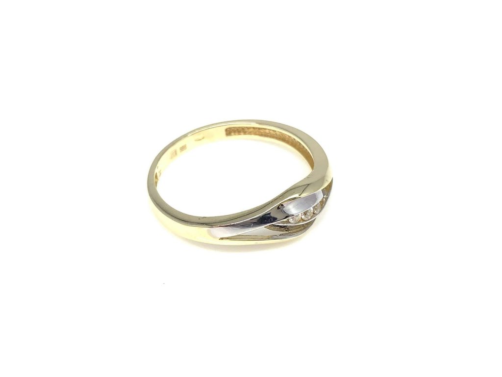 Krásný dámský prsten v kombinaci žlutého i bílého zlata (585/1000) potěší každou ženu. Prsten je v přední části šíny zdobený několika proužky. Dva jsou z bílého zlata. Mezi proužky uprostřed jsou malé bílé zirkony. Všechny naše zlaté šperky jsou opatřeny puncovní značkou uznanou Puncovním úřadem ČR. V parametru: rozměry šperku je uvedena velikost ozdoby prstenu.Doplňkové parametry