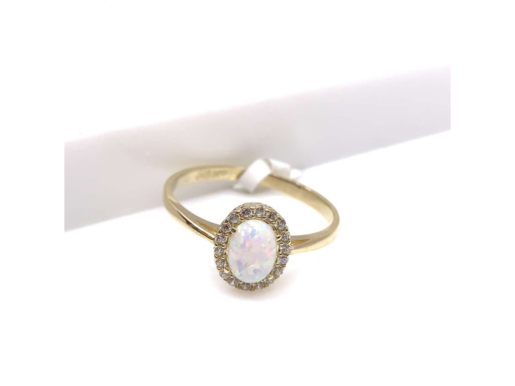 Úchvatný dámský prsten ze žlutého zlata (585/1000). Prsten je ozdoben jedním oválným syntetickým bílým opálem, který je dokola osázen malými bílými zirkony.Všechno naše zboží je označeno puncovními značkami uznanými Puncovním úřadem ČR. V parametru: rozměry šperku je uvedena velikost ozdoby prstenu.Doplňkové parametry