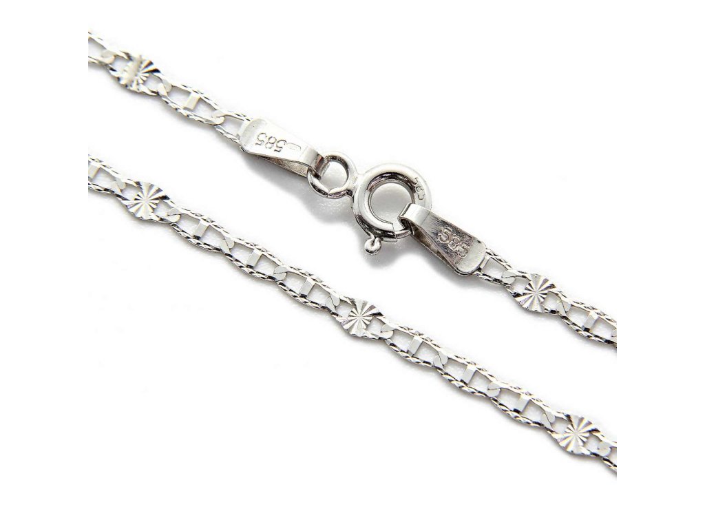 Půvabný řetízek z bílého zlata (585/1000) je zdobený a vhodný k samostatnému nošení. Povrchová úprava rhodiem zajistí šperku vyšší lesk a odolnost. Všechno naše zboží je označeno puncovními značkami uznanými Puncovním úřadem ČR.Doplňkové parametry