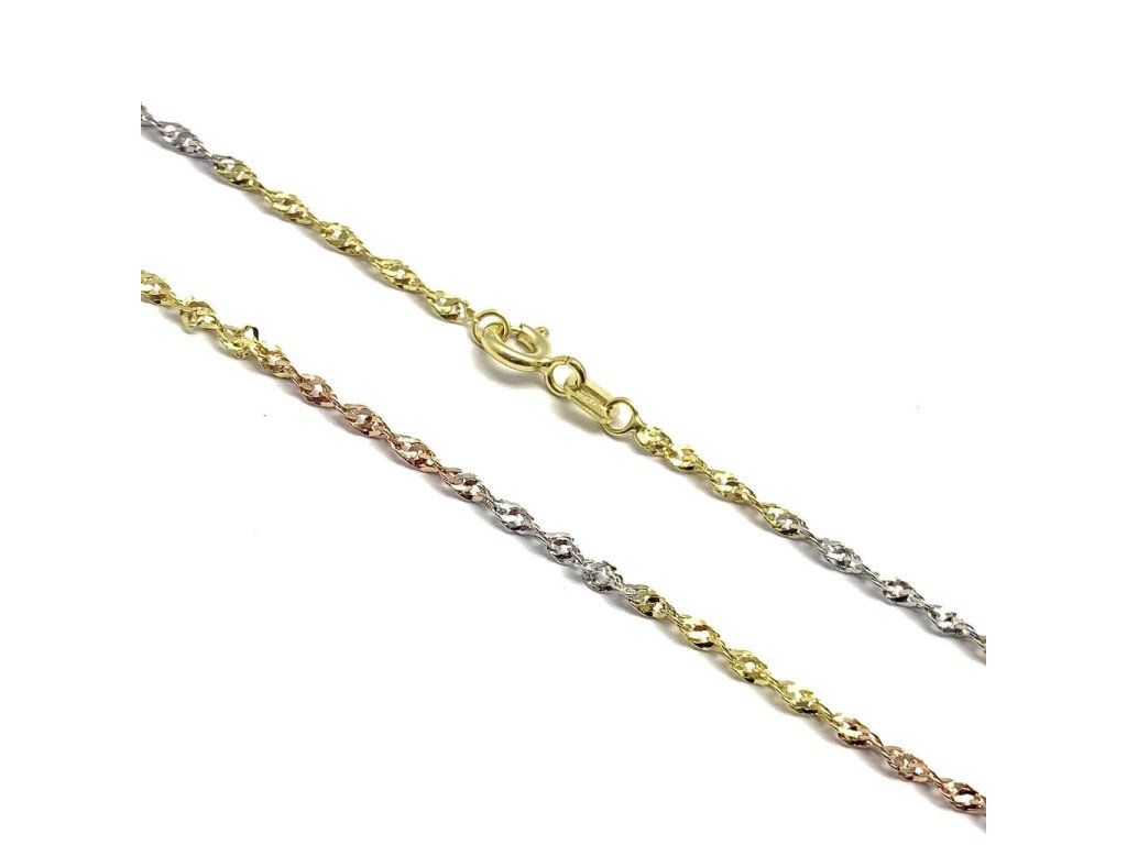 Moderní dámský řetízek v kombinaci žlutého, bílého a růžového zlata (585/1000). Druhy zlata se pravidelně střídají po celé délce šperku. Všechno naše zboží je označeno puncovními značkami uznanými Puncovním úřadem ČR.Doplňkové parametry