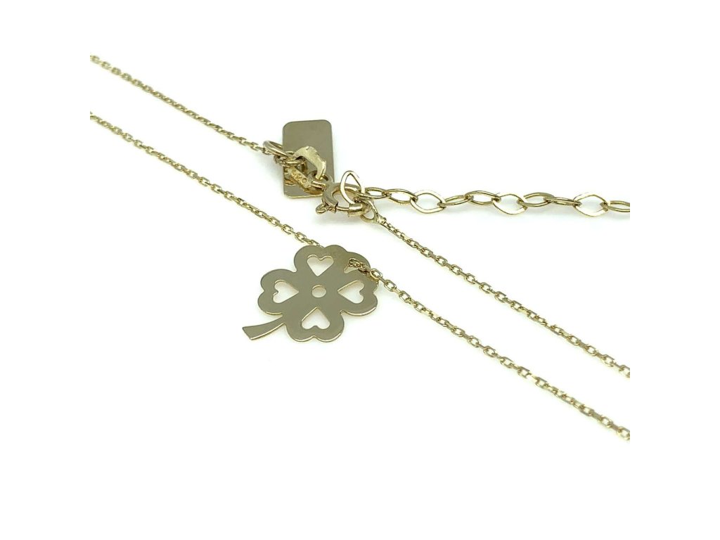 Elegantní řetízek s přívěskem ze žlutého zlata(585/1000) potěší každou ženu. Řetízek je typu anker s přívěskem ve tvaru čtyřlístku, který je hladký. Všechno naše zboží je označeno puncovními značkami uznanými Puncovním úřadem ČR.Doplňkové parametry